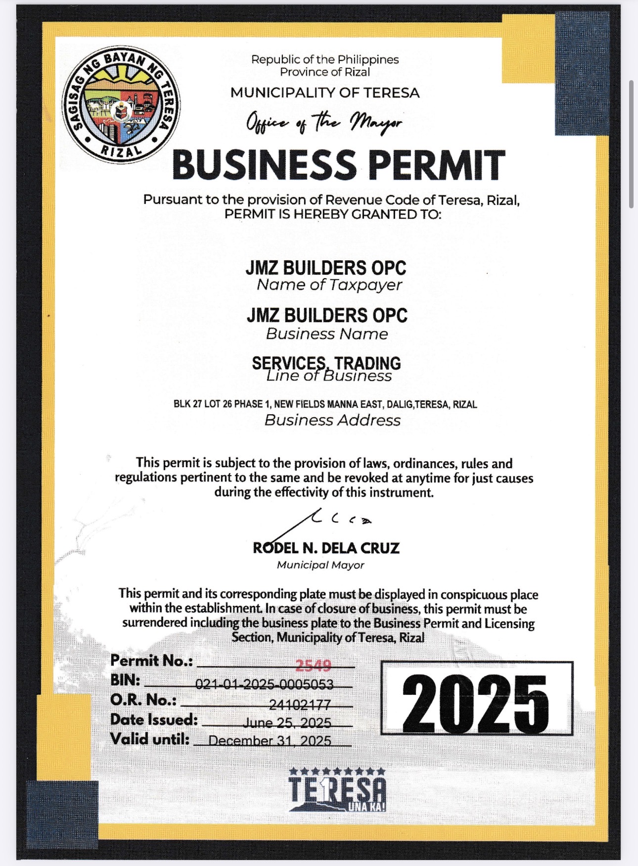 Business Address: Blk27 Lot26 New Fields Brgy.Dalig Teresa Rizal PH